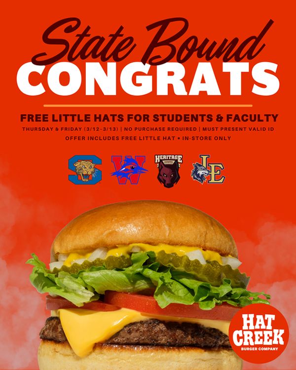 On Thursday, March 12 and Friday, March 13, students and faculty from Mansfield Summit, Austin Westlake, Little Elm and Frisco Heritage high schools get a free Little Hat burger when visiting Hat Creek with a valid student or faculty ID.