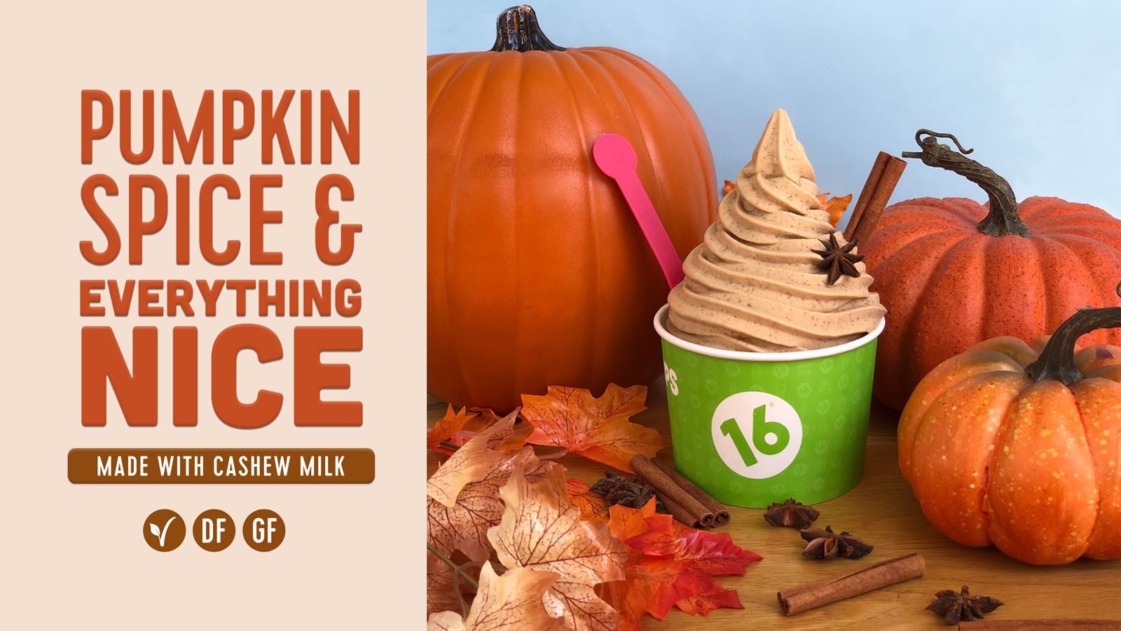 New York, NY (RestaurantNews.com) In the spirit of all things autumn, 16 Handles has launched a delicious new take on their classic pumpkin soft serve: Pumpkin Spice & Everything Nice. Naturally flavored with spices like cinnamon, ginger, and cloves, the flavor is dairy- and gluten-free, made with their chef’s signature cashew milk base. Pumpkin ice cream has always been a favorite fall dessert, and now, 16 Handles is proud to offer delicious pumpkin soft serve to its vegan fans, too.