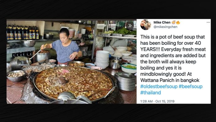 “This is a pot of beef soup that has been boiling for over 40 YEARS!!! Everyday fresh meat and ingredients are added but the broth will always keep boiling and yes it is mindblowingly good! At Wattana Panich in bangkok,” YouTuber Mike Chen wrote on Twitter, also in 2019: