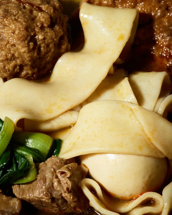What arrives on the table is a soup that’s rich and savory, filled with thick wheat noodles, the broth dyed bronze by the spices. (The kitchen is generous with star anise and takes a lighter hand with chile, so there’s only a touch of heat.) From the first sip, it’s clear that this is no purifying broth for a January cleanse: The bowl is packed with chunks of beef, a slab of braised tofu, some bok choy, and a whole egg. The highlight, though, is the meatball. It’s a little sweet and soft on the inside with a crispy exterior. (Extra meatballs can be added for a price; do this because you won’t want to share.)