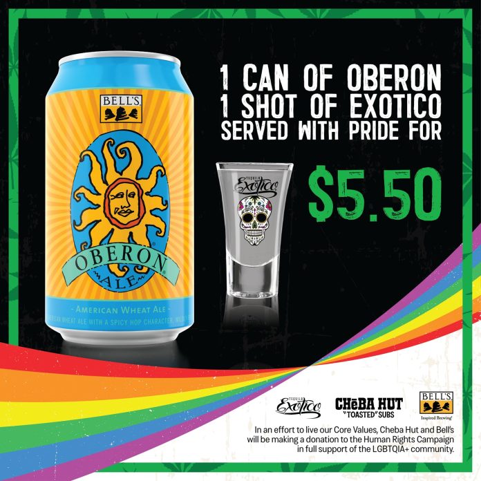 Now through the end of June, Cheba Hut is offering a bar special including a can of Bell’s Oberon Ale and a shot of Exotico Tequila for $5.50. Hut locations that only serve beer and wine will be offering a special of two cans of Bell’s Oberon Ale for the same price.