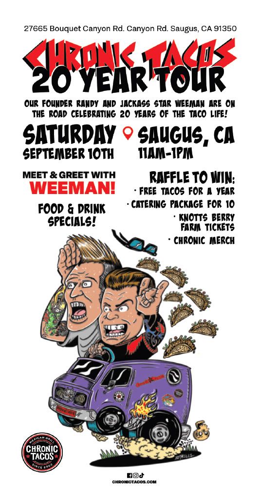 WHAT: This celebration will be hosted on Saturday, September 10th from 11 AM – 1 PM , the 20th anniversary tour will include a raffle and a meet and greet with Jackass legend and Chronic Tacos investor Jason Acuna, aka “Wee Man”. Special deals will be offered on food and beverages all day. The raffle will provide an opportunity for winners to receive an array of prizes including free tacos for a year, a catering package for 10 from Chronic Tacos, Knotts Berry Farm tickets as well as Chronic Tacos merch. Make sure you get there on time!