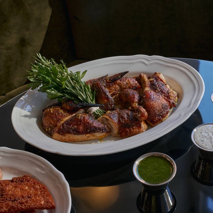 She didn’t have to go far, only to West Hartford, Connecticut, where her Lebanese-Palestinian-Jordanian family lives and still runs Tangiers, a grocery store and restaurant. Her chicken is steeped in a Lebanese seven-spice marinade, finished with citrus butter, and accompanied by zhug, red sauce, and — because it’s still the West Village, with a young demographic to appease — labne-based ranch that’s really good with Cleo’s fries, too.
