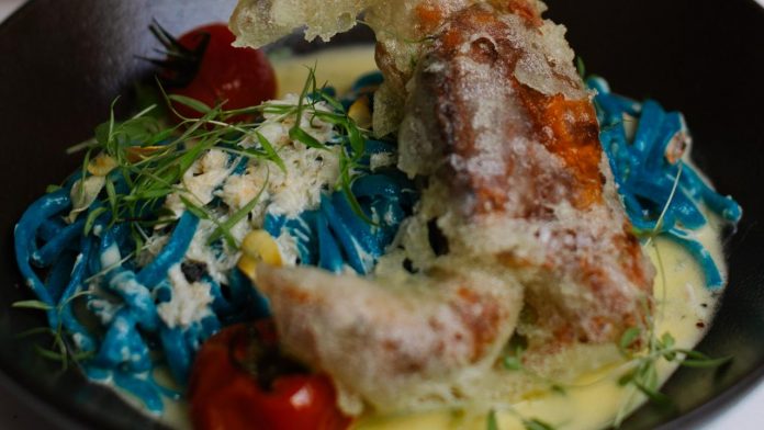 “Mark + Vinny’s signatures which have made the journey to the Byron menu include the Bucatini Carbonara, a vegan egg Carbonara – but with this vegan egg made from local heirloom tomatoes from local producer Coopers Shoot Tomatoes – and the famous Blue Spirulina Linguini with blue swimmer crab, white bisque, confit cherry tomatoes, soft shell crab.