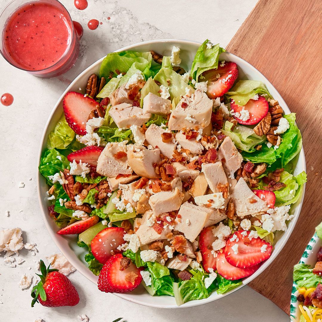 The Strawberry Pecan Salad returns by popular demand this summer, topped with rotisserie chicken, candied pecans, bacon crumbles, goat cheese and a strawberry-poppyseed dressing.