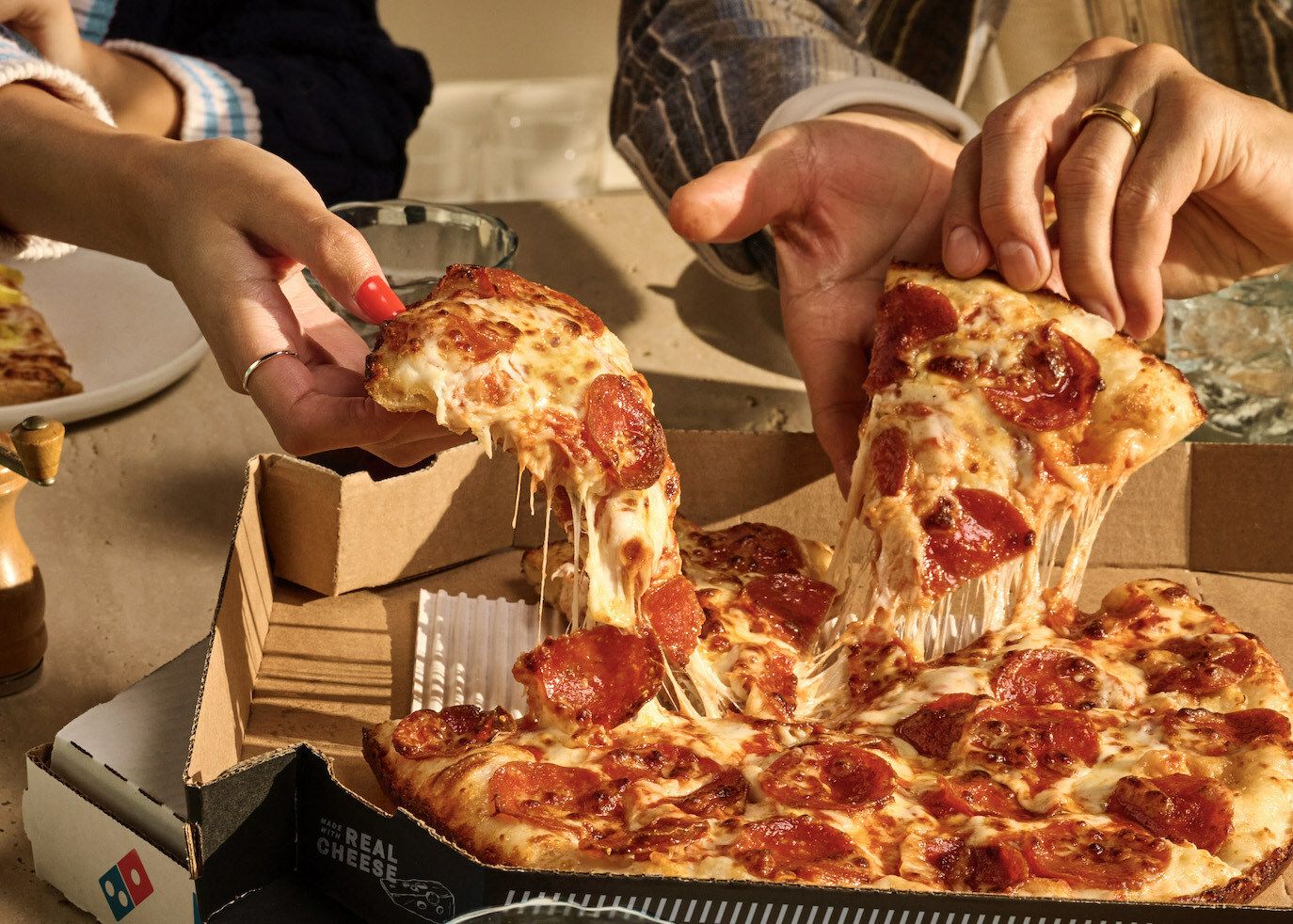 The 50% off deal is available on menu-priced pizzas ordered through Domino’s online ordering channels, which include Dominos.com and Domino’s mobile app.