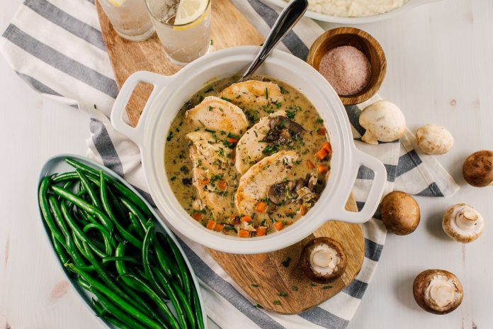 - Countryside Chicken Fricassee – Sautéed chicken breasts cooked in a creamy French white wine sauce with mushrooms, carrots, and celery.
