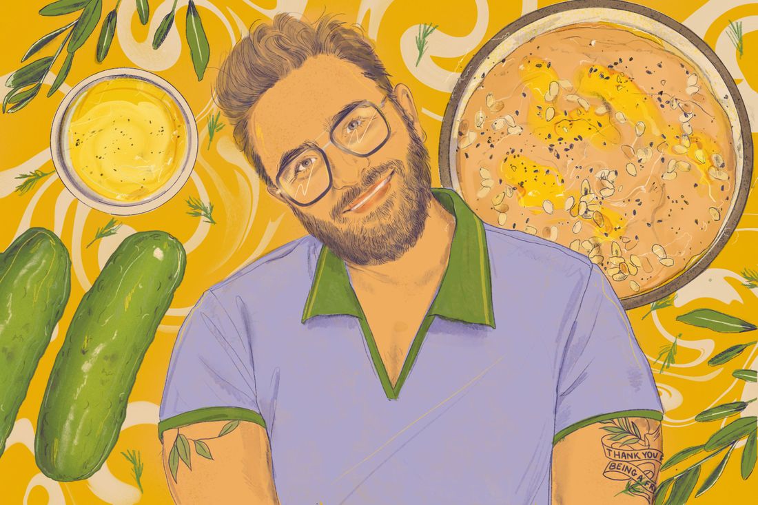Eliot Glazer is debating the merits of a rainbow bagel — not for quality but for where a rainbow bagel lands on the spectrum of Jewish to goyish, which also happens to be the premise of his new Comedy Central web series, 2 Jews Choose. As he puts it, “There is something distinctly goyish about an adult person getting unicorn or strawberry cream cheese. It’s just like, Yeah, that belongs in a church basement, you know?” Not that he dislikes sweet foods. In fact, the comedian, writer, and producer — who’s worked on shows such as New Girl, Younger, and Broad City (with his sister, Ilana) — is constantly trying to balance his sweet tooth. “One of my best friends makes fun of me because he thinks my version of eating is nonstop desserts and then I fill in the blanks with handfuls of nuts,” Glazer jokes. “It’s not true but not completely untrue, either.”