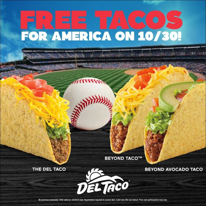 To combat a competitor’s “Steal a Base, Steal a Taco” promotion, Del Taco will be giving away FREE tacos all day and night tomorrow, Wednesday, 10/30. No need to wait until the afternoon!
