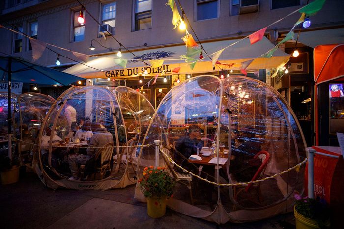 Bubbles of various sorts have shown up around the country since restaurants began to ease into this new, strange era of dining out. In New York, the early adopter was Café du Soleil, a French place on Broadway and West 104th Street on the Upper West Side. Owner Nadine Chevreux says her husband began looking into bubbles this summer, worrying about the cold, wet months ahead. Initially, the couple bought one off Amazon as an experiment, and diners responded so well that they just kept on buying more; now they’re up to 16, and they look like two rows of transparent moon landers standing out on the upper Manhattan sidewalk. So far, customers are loving them. “Some of them view it almost as a gimmick; it makes it a little bit futuristic. It’s nice that you can make your own vibe in your own bubble,” Chevreux says. Not only are the bubbles Instagram-worthy, “they’re warm; they’re cozy. It’s like your own little private dining room outside,” says Stephen Werther, the owner of Suprema Provisions on the West Village, which installed its own bubbles just days ago.