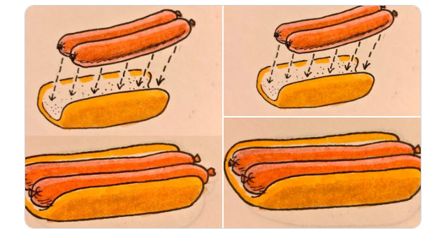Maybe, just maybe, the 2010s weren’t a wash after all? In what can only be described as the greatest advancement in food-delivery technology this century, cartoonist and inventor Joe Dator has revealed his illustrated renditions for the — yes, it’s true — two-hot-dog bun. The possibilities are seemingly endless. Just imagine: You can top each hot dog differently, wrap one in bacon and the other in prosciutto, fry one and grill the other, and so on and so on. Grub has a message we’d like to send out to one Alisa Nutting, who famously said in her bonkers Grub Street Diet, “Two dogs per bun is my preferred meat-to-bun ratio.”
