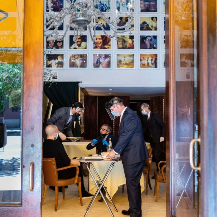 Your future has been served. Yesterday, Soho restaurant Cipriani Downtown ran a test service with waiters wearing PPE. Photographer Tim Fadek documented the scene around 1:30 p.m., when he saw five individuals who, if not for their gloves, masks, and face shields, would look like they were teaching students in a culinary school. When he asked who they were, they identified themselves as management and said they were conducting experiments. “My third and last question was, ‘What are you doing?’” Fadek says. “They replied, ‘trying something out.’” (The restaurant, the men also confirmed, is not actually open to the public.)