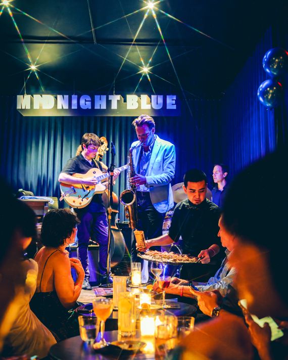 The club is blocks away from Little Branch, where saxophonist Vito Dieterle has booked the nightly set for 20 years. He’s also the music director at Midnight Blue in Gramercy. It’s owned by Jae Yang and bartender Takuma Watanabe of Martiny’s, the high-end cocktail bar two blocks away, and maintains the same emphasis on well-made drinks, like a lapsang souchong–infused old-fashioned and a textbook example of a whiskey highball. Midnight Blue’s long bar runs down one side of the black-and-white-tiled room, leading to small tables and the inset bar.