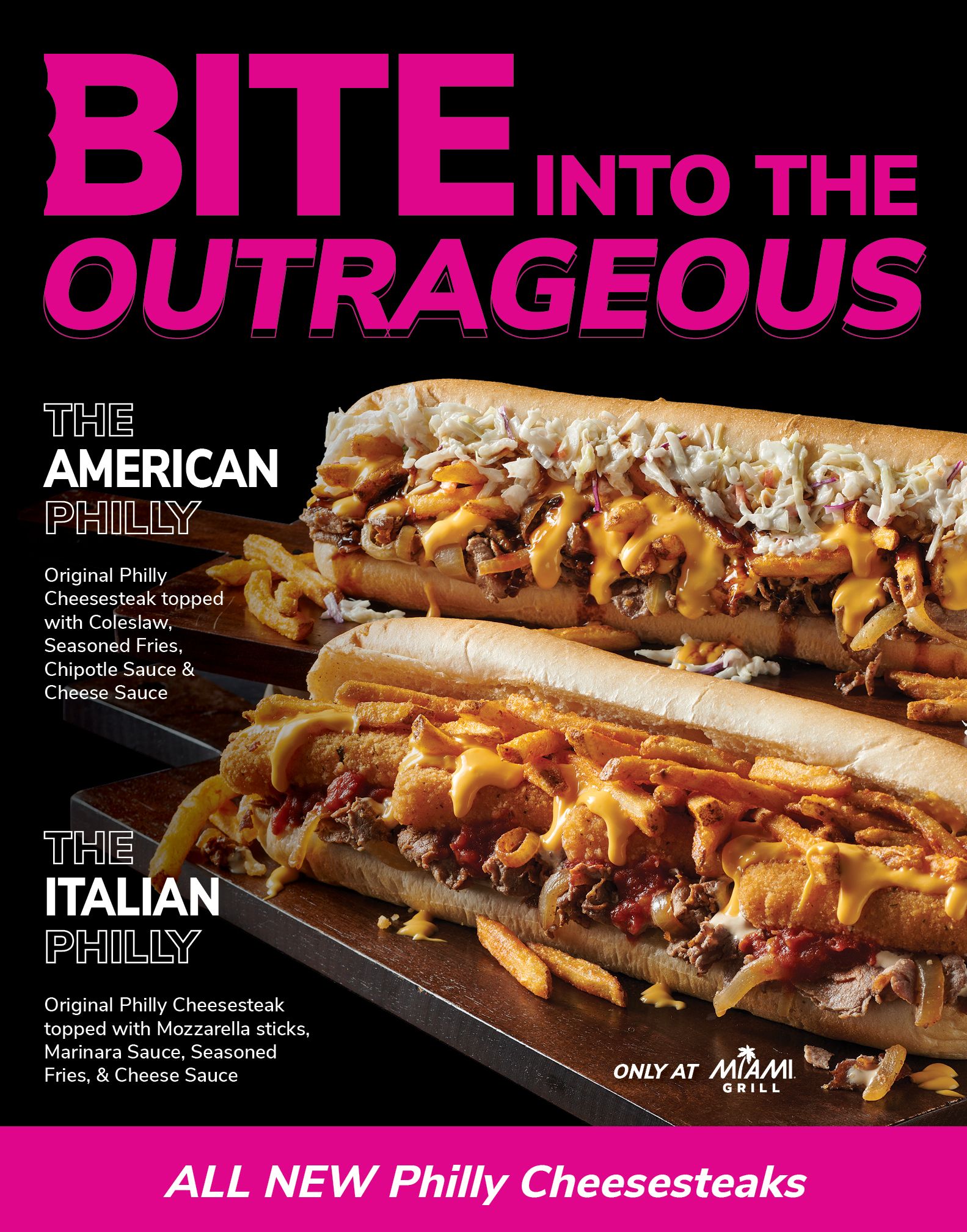 “Our Philly Cheesesteaks are legendary and fan favorites, so we set out to create something different and out of the ordinary that we knew our fans would love. One look at those ingredients, and you get it: these sandwiches are over the top,” says Jackie Maceda, Miami Grill’s Director of Marketing. “They are big, bold, definitely messy and outrageously flavorful.”