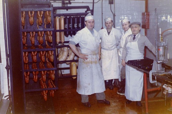 Morscher’s Pork Store founder Joseph “Pepi” Morscher (farthest left) and his father, Joseph Morscher (far right), circa 1963. Photo: Morscher’s Pork Store