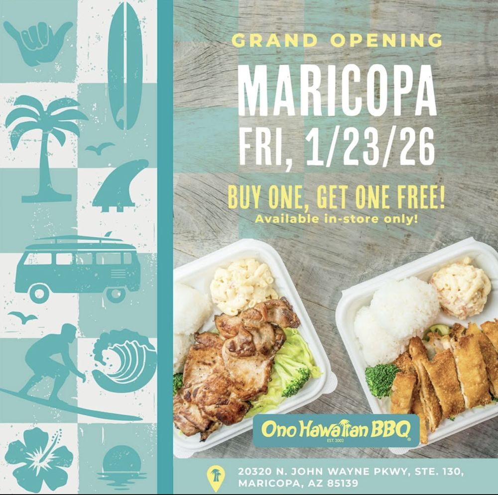 To celebrate the opening, Ono Hawaiian BBQ will host a Grand Opening celebration featuring live Hawaiian dancer performances, merchandise giveaways, and an all-day Buy One, Get One Free offer, available at the Maricopa location only.