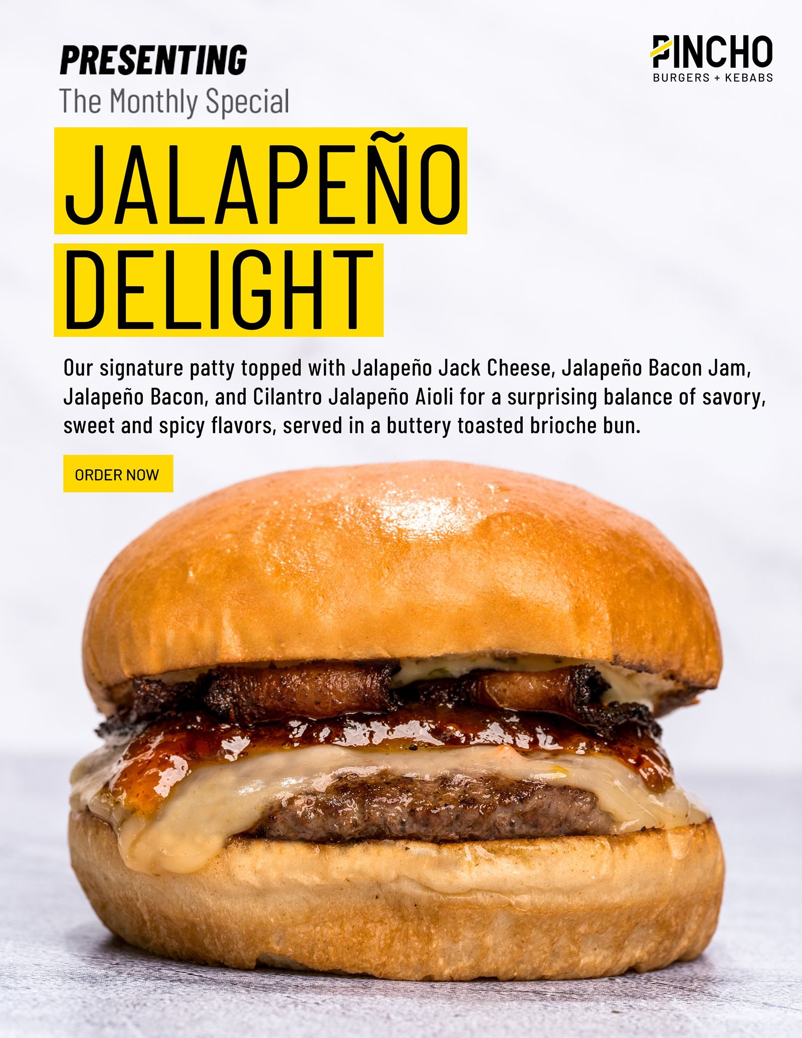 The PINCHO team — led by Director of Culinary Adrian Sanchez and Co-Founder Otto Othman — competed and won with the Jalapeño Delight. The dish starts with its signature PINCHO patty and is topped with Jalapeño Jack Cheese, Jalapeño Bacon Jam, Jalapeño Bacon, and Cilantro Jalapeño Aioli for a surprising balance of savory, sweet and spicy flavors. The Jalapeño Delight will be available in all PINCHO stores through March 3.