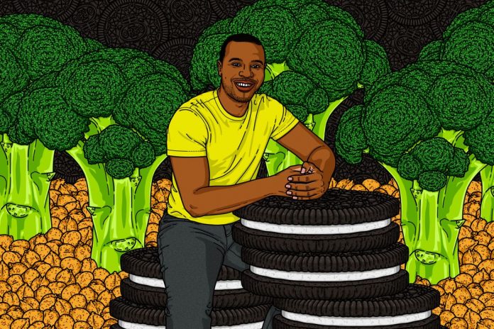Jabari Brisport in a field of broccoli. Illustration: Eliana Rodgers
