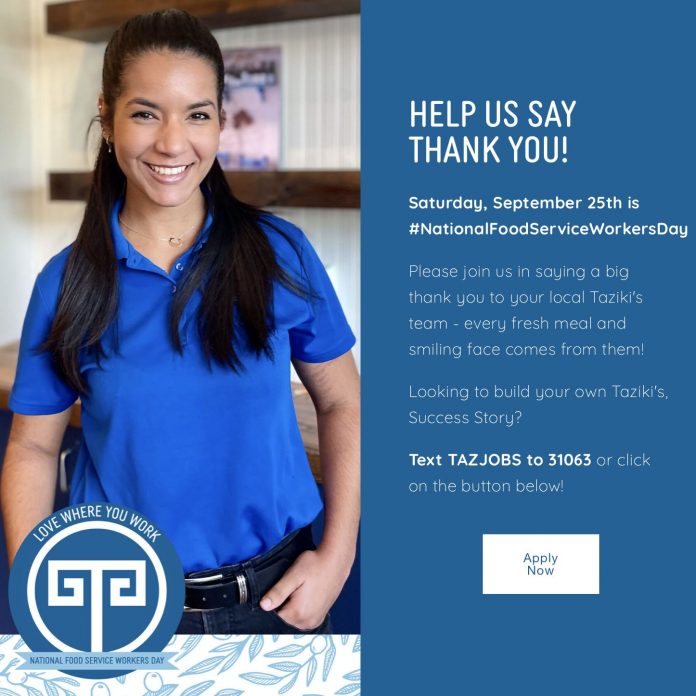 Taziki's Mediterranean Cafe Celebrates National Food Service Workers DayBirmingham, AL  (RestaurantNews.com)  September 25 is National Food Service Workers Day, and Taziki’s Mediterranean Café will be dedicating this occasion to recognize its current employees on social media, the company’s website and in Taziki’s restaurants. It is also Taziki’s hope that sharing their employees’ stories will encourage others to join the Taziki’s team.