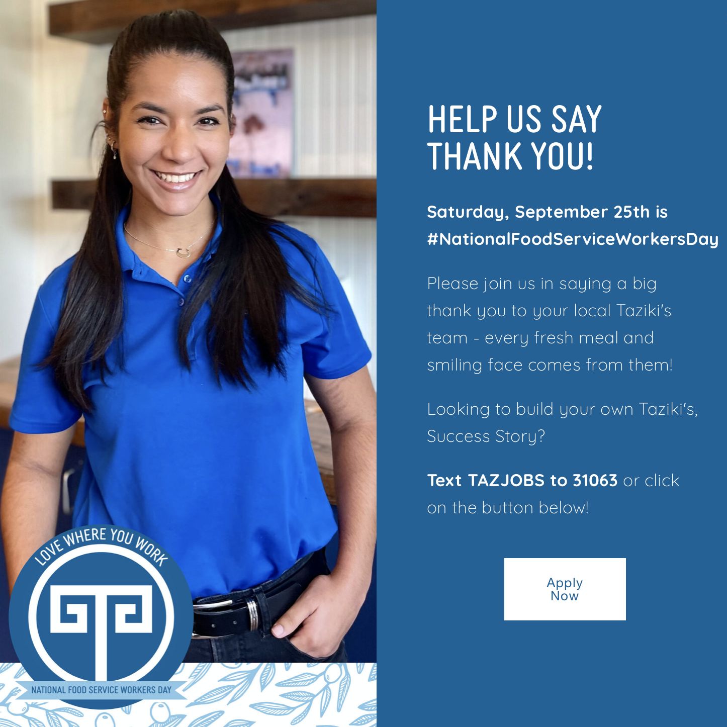 “Today’s restaurant workforce is rapidly changing,” said Simpson. “Managing a business and hiring is hard but Taziki’s has had great support along the way. Our new as well as seasoned employees are extremely valuable to us. We are thankful to support their growth at our restaurant and spotlight them on National Food Service Workers Day.”