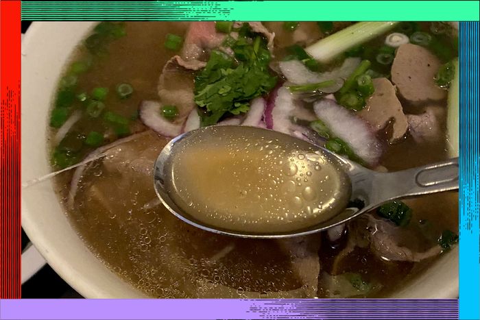 Behind me, almost every diner had a deep bowl of something brothy. I had come for the house pho, which is made with a beef stock that simmers for 24 hours. Switching between a mouthful of brisket and a gulp of soup, I started to see everything according to the broth binary. Anything could be a broth, unless it was not. My pandan soy milk: chilled broth. My morning coffee: upper broth. A carafe of sake: downer broth. Dumplings: decidedly not broth, but certainly a thing that has a wonderful relationship with broth.
