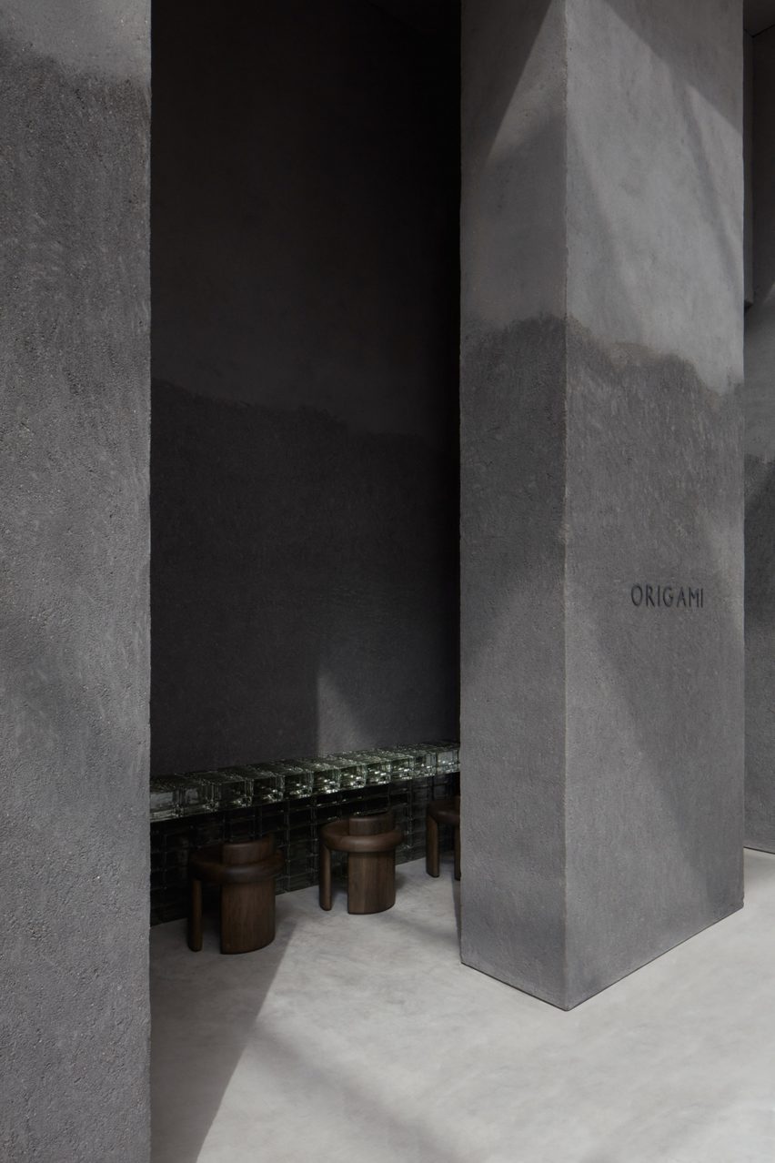 The interior features monolithic columns and walls informed by the architecture of temples, along with seating covered with draped fabric and textured glass partitions that contribute to the feeling of “intrigue and mystery”, the studio said.